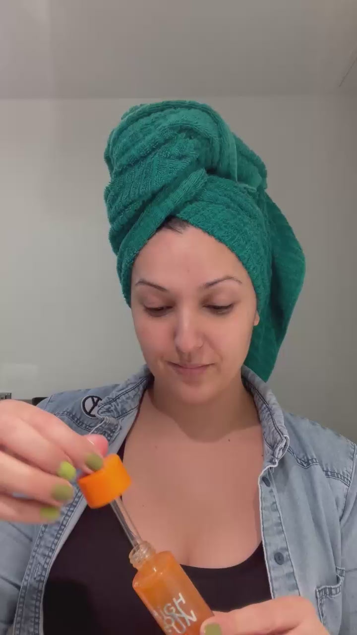 Drei bis vier Tropfen reichen für das gesamte Gesicht. Vitamin C verstärkt deinen natürlichen UV-Schutz, ersetzt jedoch keinen Sonnenschutz. Verwende tagsüber immer zusätzlich einen Breitband-SPF 30+.